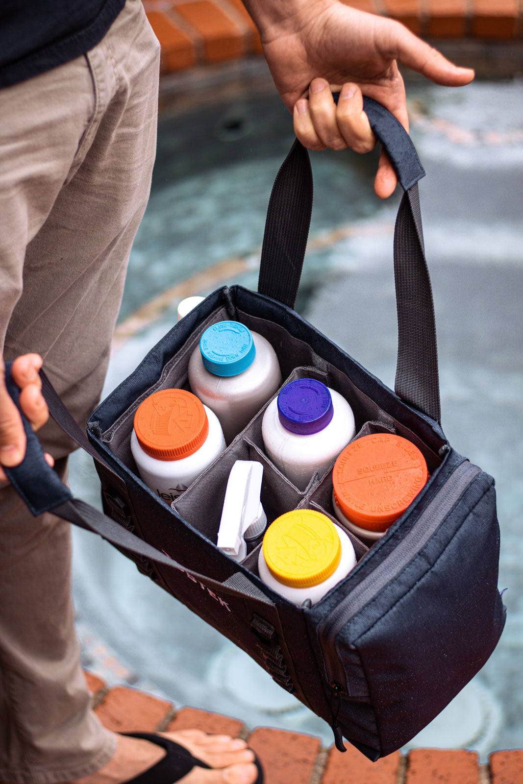 The ChemBag is here to replace the grocery bags, random buckets, and under-sink cabinet messes. Now you can conveniently transport your kit to and from your hot tub.